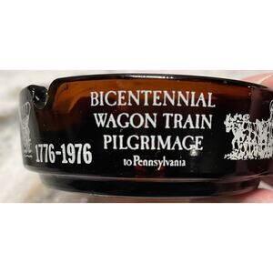 Vintage Bicentennial Wagon Train Pilgrimage To Pennsylvania Ashtray Amber Glass