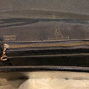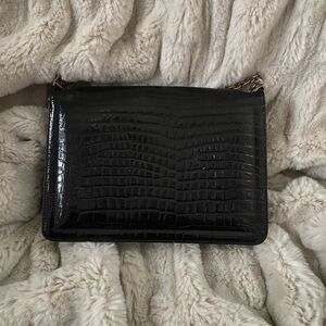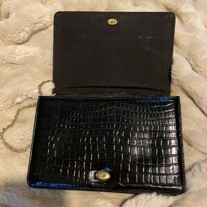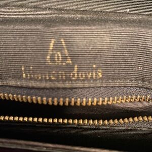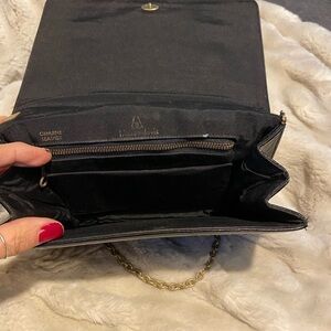 Elegant vintage bag by luxury designer Bienen Davis. Made of black embossed leather with a faded gold tone hardware. It has an adjustable chain strap so you can wear the bag on your shoulder or elbow. The bag is in very good vintage condition. Inside there is one black zip pocket and one slip pocket.
