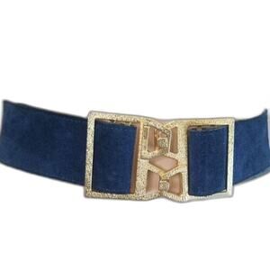 Vintage Big Gold Interlocking Cut Out Buckle Wide Blue Suede Belt Adjustable