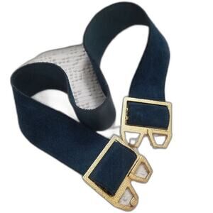 Vintage Big Gold Interlocking Cut Out Buckle Wide Blue Suede Belt Adjustable One Size Fits All