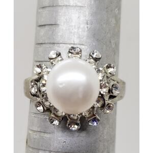 Vintage Silver Cocktail Ring with genuine Pearl and Rhinestone Cluster, Women’s Size approx. 9