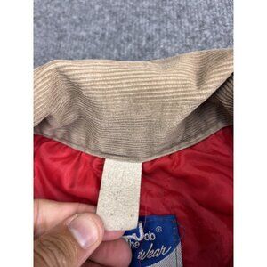 Features: Heavy duty coveralls, olive green exterior, red quilted insulated lining, tan corduroy collar, full front zip, two front chest zipper pockets, hip pockets, back zipper pocket, lower leg zippers for easy boot access, adjustable waist, long sleeves. Tag reads: On The Job Wear Big Smith.