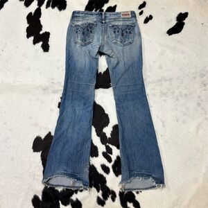 Keywords: Big Star, bootcut jeans, women's jeans, blue denim, distressed, embroidered, vintage style, mid-rise, casual wear, machine washable, 5-pocket design, medium wash, regular fit, all seasons, comfortable jeans.