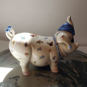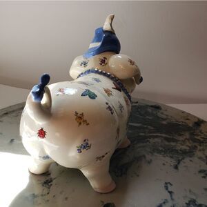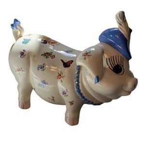 Unique Vintage Big Pig w/Feathered Hat, Embellished Collar, Butterflies, Flowers, and a bow on the tail.