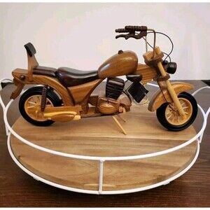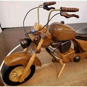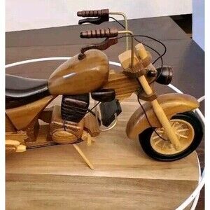 The product is a vintage Harley-Davidson motorcycle toy-model made of wood. It is a homemade collectors' item designed for boys and girls. The toy-model represents the bikercore theme and features a brown color scheme. With its Harley Davidson branding and United States origin, this unique wooden toy-model captures the essence of classic motorcycle culture.