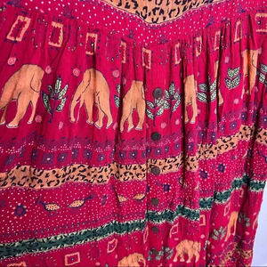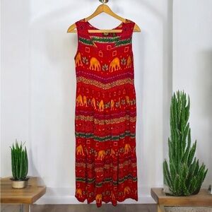 Vintage Bila Boho Elephant Print Rayon Maxi Dress Red Sleeveless Button Front