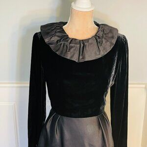Fitted late 1970's early 80's classic, timeless and elegant fitted cocktail dress. Major Audrey Hepburn Breakfast at Tiffany's vibes. Velvet bodice with substantial weight silk satin structured skirt. Skirt is gathered with small inverted pleats.Featuring a platter style large ruffled collar, very small shoulder pads, waist hook/eye ribbon fastener, zips up back. Long sleeves with velvet covered buttons that fasten with loops. No fabric tags but skirt and all lining feel like silk, velvet could possible be silk or a blend. Union made tag. Stunning classic little black dress, perfect for corpcore special events, weddings, holiday parties, etc. Fitted and feminine.