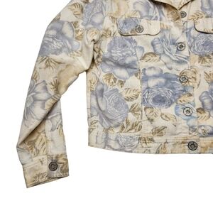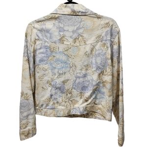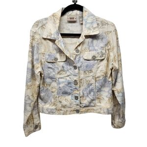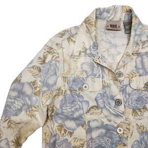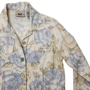 Bill Blass Vintage Linen Blend Jacket. 90s Y2K Off-White with Blue and Tan Floral Print. Button Front Closure, Long Sleeves, 2 Button Close Chest Pockets, 2 Front Pockets.
