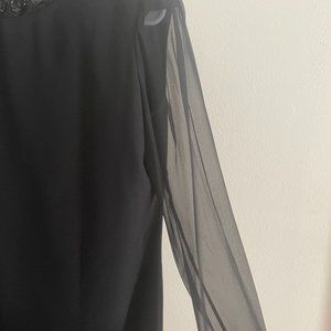This is such a cool vintage Bill Blass dress in black and a size 10. It features a crew neck shift dress style, has beaded and sequin accents on collar and cuffs, has long sheer silk sleeves, and a concealed back zipper with padded shoulders. The dress is fully lined and is 50% polyester and 50% acetate with 100% silk sleeves. This dress is in perfect shape! Some measurements are: bust 41", waist 38", hip 40", length 38.5"