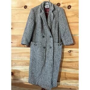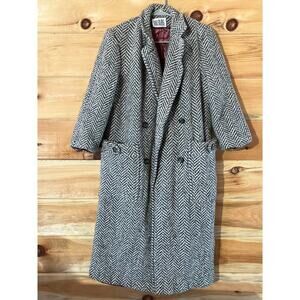 Vintage Bill Blass Woman's 100% Wool Button Trench/Long Coat. Grey/white herringbone. Lined. heavy!
