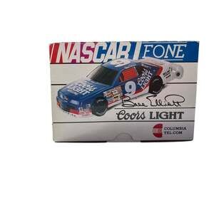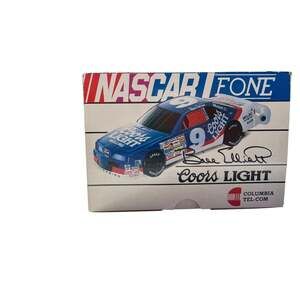 Vintage Bill Elliott #9 Coors Light NASCAR Fone, a unique race car phone from Columbia Tel-Com. This collectible item features the iconic blue and white Coors Light livery and Bill Elliott's signature. The phone's headlights flash when it rings, adding a fun, authentic touch. It includes a mute switch, last number redial, and tone/pulse switchable options. It fits any modular jack and comes complete with a power cord. This 9"x3.5" NASCAR phone is in its original packaging, perfect for collectors and racing enthusiasts.