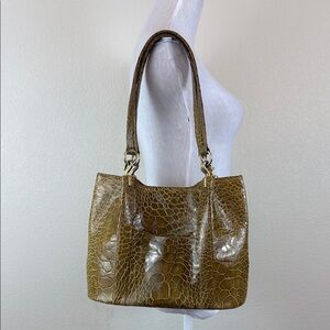 This medium-sized shoulder bag features a luxurious crocodile-embossed pattern in a rich brown hue. Its glossy finish and structured yet soft form make it an elegant choice for everyday use. The gold-tone hardware adds a touch of sophistication, perfectly complementing the warm color of the bag.