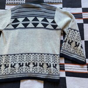 Sweater is in Excellent shape with Light Wear, No spots, stains, snags, holes or fade. Amazing Print with White Black and grey coloring! I believe it to be Acrylic Blend but cant be sure.. No Tag so Please check photos for condition and measurements for correct size! Let me know if you have any questions!
