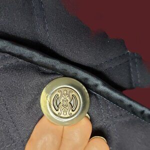This quilted jacket features a timeless design with velvet accents, providing both sophistication and warmth.in excellent condition only the buttons are peeled from smoke and pet free home.