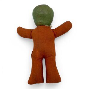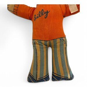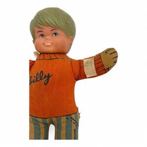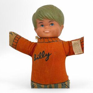 This vintage Billy doll from the Ronald Co. represents the charm of the 60s/70s era. With its distinct retro design, it adds a nostalgic touch to any collection. The doll features an orange sweater and striped pants, embodying a classic style. Its soft construction makes it a delightful piece of memorabilia.