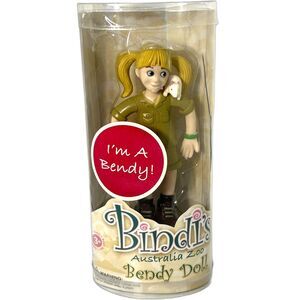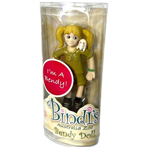 This is a Bindi’s Australia Zoo bendy doll, an officially licensed Steve Irwin–era collectible from Australia Zoo. This vintage figure features Bindi Irwin in her classic khaki outfit with a small white animal companion on her shoulder. In new, unopened condition with some damage to box.