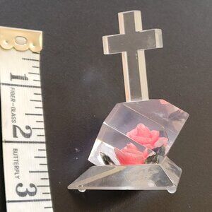 Vintage Bircraft Indiana Lucite Crystal with Embedded Pink Rose in Polygon & A Cross Atop, on Base Stand with 3 tiny feet