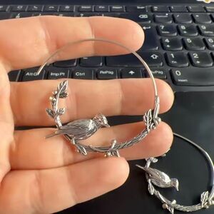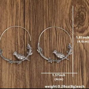 Elegant silver hoop earrings featuring a bird and branch design.