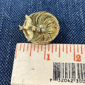 Vintage Bird Nest & Eggs Brooch Pin Gold Tone Wire 3 Pearl Eggs 1 1/2”