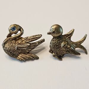 Vintage Bird Pair: Gold Toned Swan with Green Eye and Pheasant in Flight