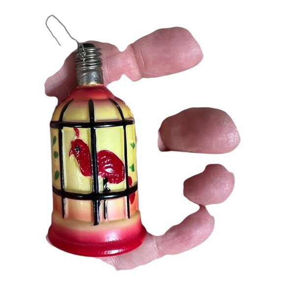 This is a very old, glass light bulb that has been used as a Christmas ornament.