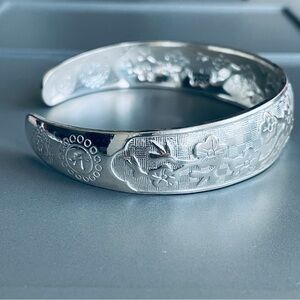 Vintage Birds Flowers Textured Sterling Silver Chinese Japanese Cuff Bracelet