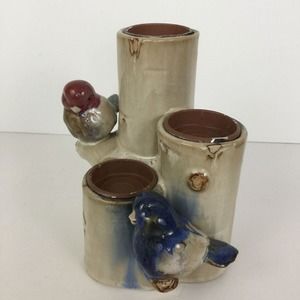 Vintage Birds on Tree Branches Figurine Candle Holder Triple Vase Glazed Ceramic