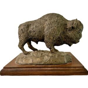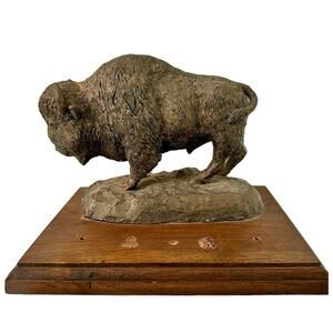 Capture American wildlife with this vintage bison sculpture by renowned artist Bob Haynes. Signed 1976, this handcrafted piece is cast in bronze and mounted on a wooden base, originally gifted as a pen holder, says the original owner. A perfect addition to any collection of Western plains decor.