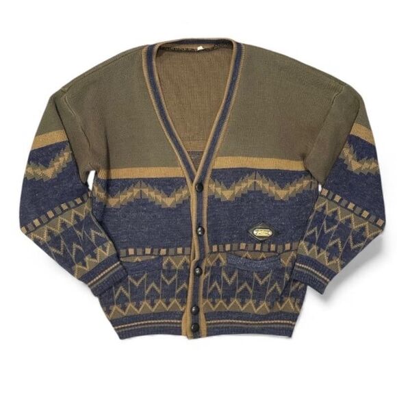 Vintage Bison Sweater Sz L Green Blue Button Cardigan Aztec Pattern Knit Retro Unisex