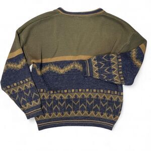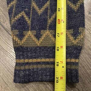 Color: Olive green and navy blue with tan geometric/Aztec-inspired knit pattern.