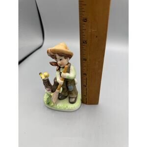 Add a touch of vintage charm to your collection with this sweet bisque porcelain figurine featuring a young boy in overalls holding a broom beside a tree stump and a little yellow bird. The piece stands approximately 4.5 inches tall and resembles the classic Homco or Hummel-style figurines made in Japan during the 1970s–1980s.