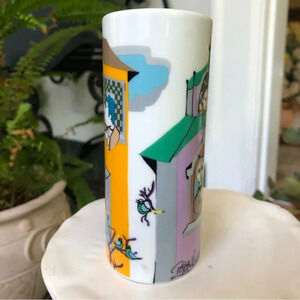 Absolutely beautiful and so rare! This is a vintage piece created and signed by the famous Bjorn Wiinblad for Rosenthal in Germany. This series was called, "Scenes from a Window." The vase is a unique oval shape and stands 5" tall. It is in excellent condition.