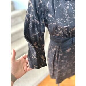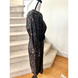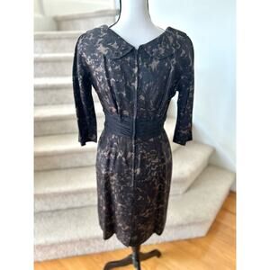 Excellent condition. Vintage 1960s (early 60s) sheath cocktail dress. Black and tan abstract floral. Wide neck, peter pan collar. Bracelet length sleeves, full back zipper. Ruched attached belt with bow at waist.
