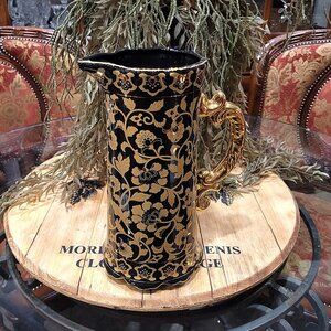 Stunning Vintage Black & 24K Gold Plated Ruffle Edge Porcelain Pitcher Vase ~ Approx. 12" High ~ This Beauty is Sure to Make a Statement in a Black Glossy Finish with 24K Gold Accents Swirled Upon a Lovely Floral Pattern ~ Very High End Looing ~ Displayed as a Pitcher alone or Fille with Beautiful Floral Bouquet ~ This will Surely Attract Attention ~ All Sales Final on Collectibles ~ Like New Condition ~ No Chips, Breaks or Repairs ~ Gold is Pristine ~ Not Intended for Food ~ Decoration Only.