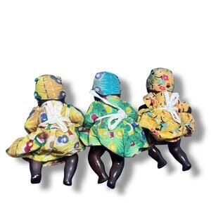 Charming set of 3 vintage Black Americana porcelain dolls, each dressed in colorful floral-patterned dresses with matching headwraps and white aprons. The dolls feature hand-painted porcelain faces with expressive eyes and red lips, showcasing classic vintage craftsmanship.