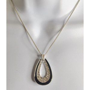 Simple yet sparkly vintage black and silver teardrop pendant necklace. It's on a silver tone chain with a lobster clasp closure, and has a hang tag stamped SHB. It has a 1 1/2 inch open teardrop pendant made from a silver tone metal. The outer layer is done in black enamel, and the inner layer is encrusted with sparkly clear rhinestones. Perfect for special occasions, as bridal wear, or as a gift!
