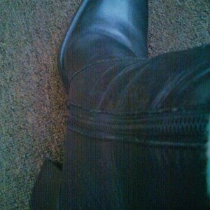Black vintage leather square-toe ankle boots in good shape. These boots have been worn. Heels are 3 inches. Brand unknown. Zipper on the side. Chunky heel.