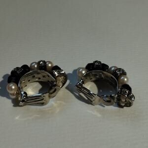 Vintage Black Bead Faux Pearl Rhinestones Silver Tone Half Hoop Clip-On Earrings