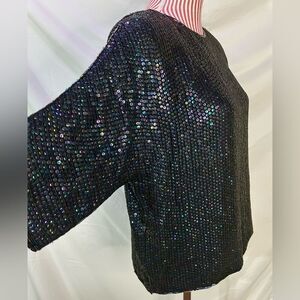 Vintage Black Beaded Blouse 100% Silk Sequin Rainbow Sparkly Retro 80s Sz Medium