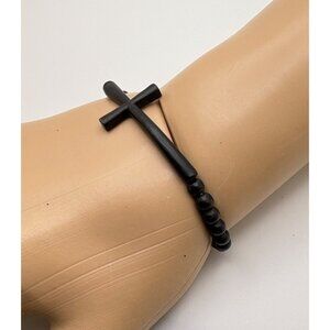 This bracelet features a black beaded design with a cross charm, providing a simple yet meaningful accessory for everyday wear.