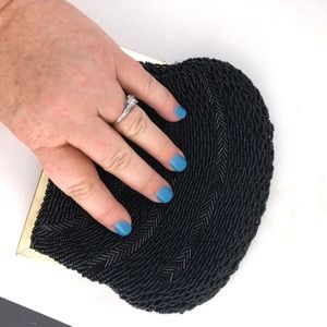 True vintage beaded handbag. Covered in glass black beads. Excellent vintage condition. Very clean. Chain handle will fold inside to allow to carry as a clutch purse.
