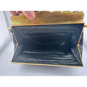 Vintage Black Beaded Evening Handbag w/ Magnetic Gold Scallop-1950s-fold over closure. Purse has two pockets inside-black interior. Beaded carrying strap.
