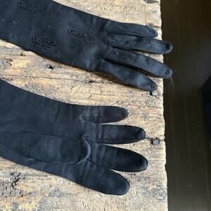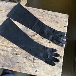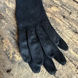 Elegant pair of vintage 1950s Crescent brand opera gloves. Made of 100% black cotton with delicate hand-sewn black bead embellishments. These size 6.5 gloves measure 16.5 inches long, making them perfect for formal wear, opera, or vintage costume styling. A rare mid-century accessory that adds sophistication to any look.