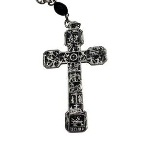 Vintage Black Beaded Rosary Silver Tone 22” Cross Christian Religious Catholic