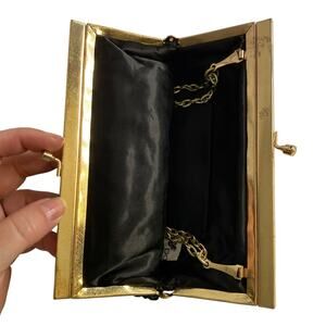 Elegant vintage black beaded and sequin clutch from Partners by Mervyn’s, made in Hong Kong. This stunning evening bag features intricate hand-sewn black beading and sequins in a chevron-inspired pattern with a kiss-lock gold-tone frame. Lined interior with chain strap that can be tucked inside. Perfect for weddings, holiday parties, and formal events.
