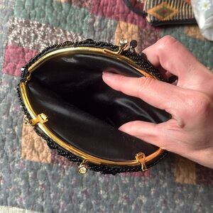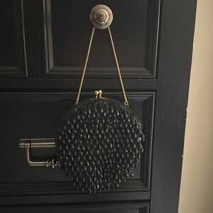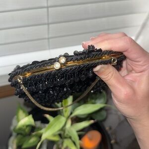 Chic round evening bag with intricate black beading. Perfect for special occasions.