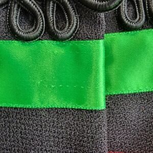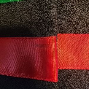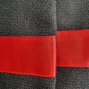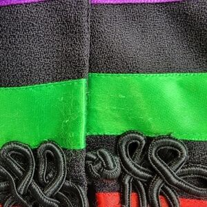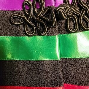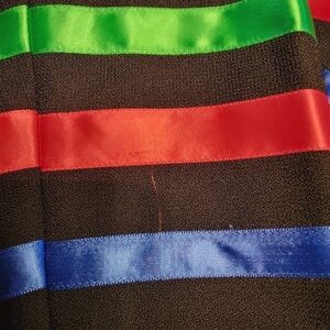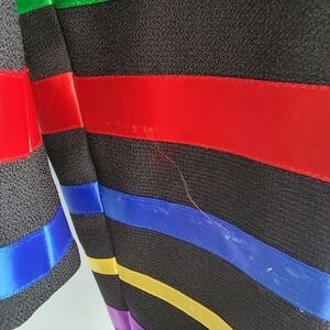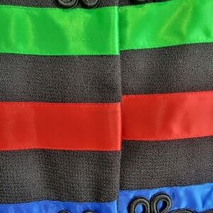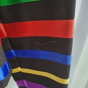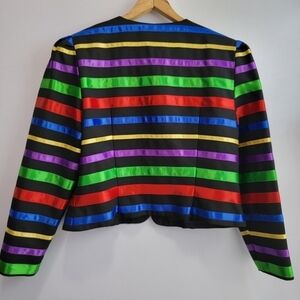 Good Vintage Condition Maggy London fully lined Petite Size 14 Black Blazer with Colorful Ribbon Stripes, hidden snap closure with brocade accent and buttons. Some flaws but they do not take away from this fun and funky Blazer.