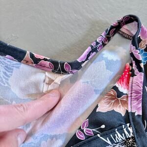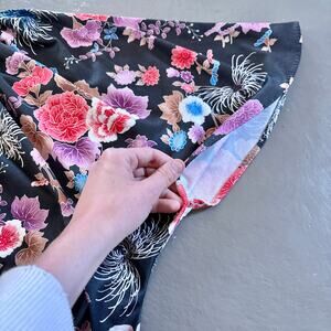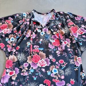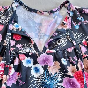 Vintage black boho blouse with pink, purple, and blue floral print. Features flutter sleeves, blouson shape, and a soft tie at the collar. No size tag but fits like a large. Excellent vintage condition.