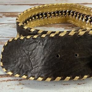 Vintage Black Braided Leather Belt with Gold Buckle Unisex Adjustable Small