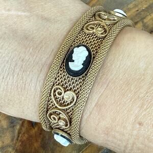 Vintage Black CAMEO Mesh BRACELET - 7" Gold Tone Mesh w/Scrolls - 1960s-70s
